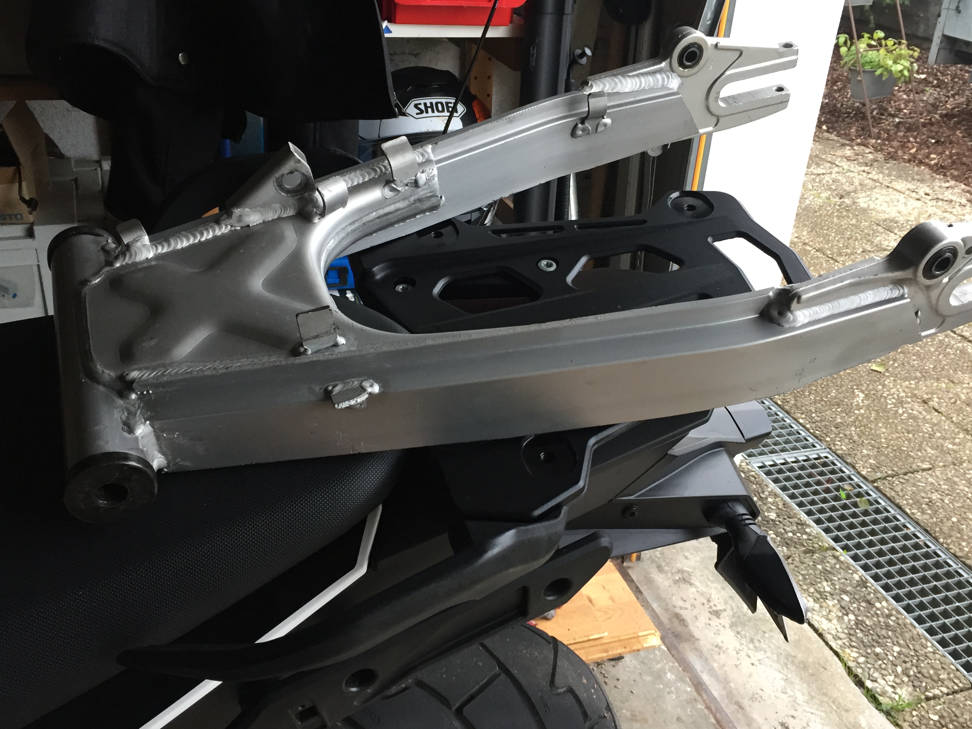Die Schwinge wird geputzt die Schutzblechhalterung muss hingeschweißt werden und kommt dann zu Emil Schwarz. Dort werden ihr neue Lager verpasst.