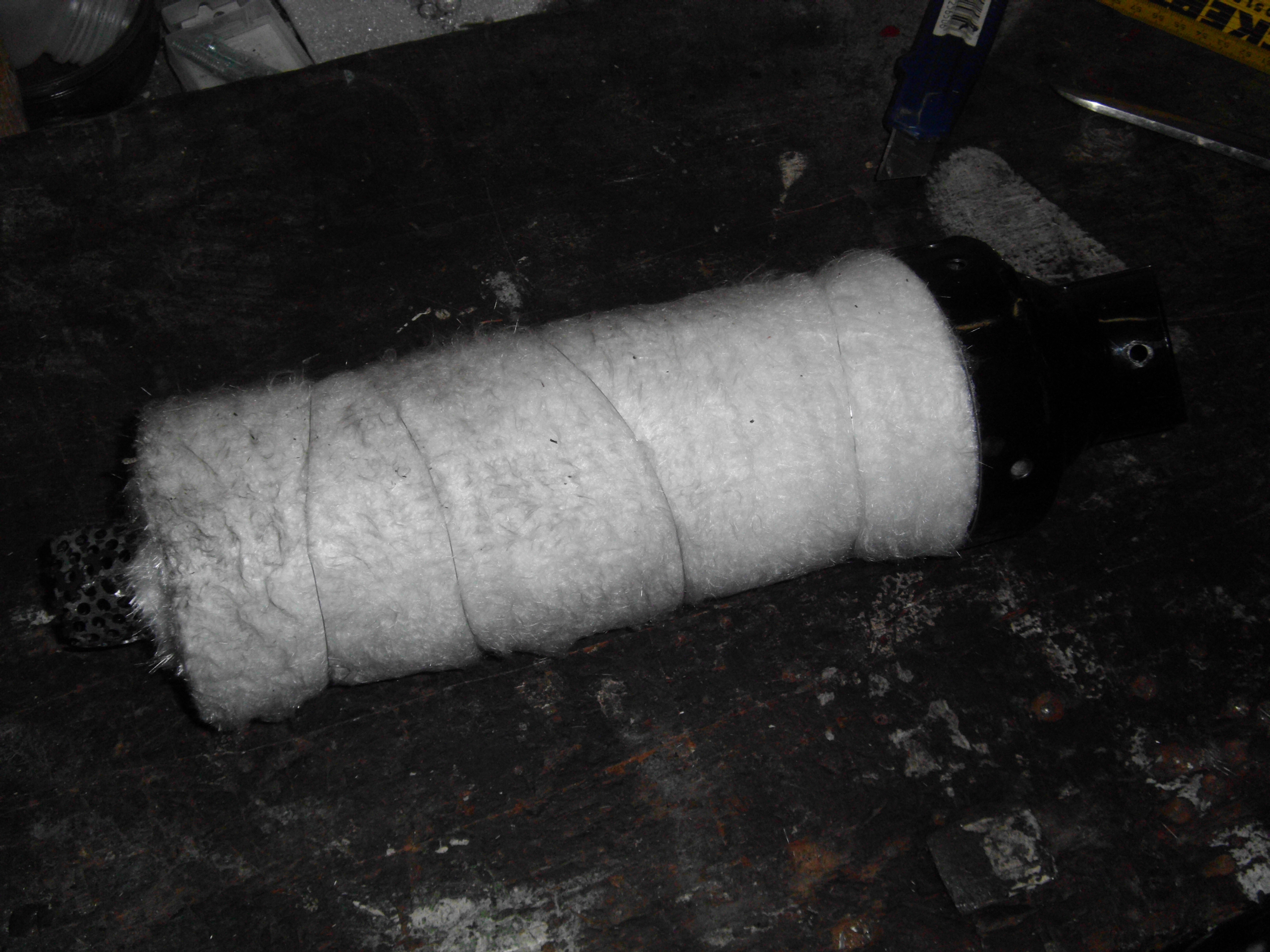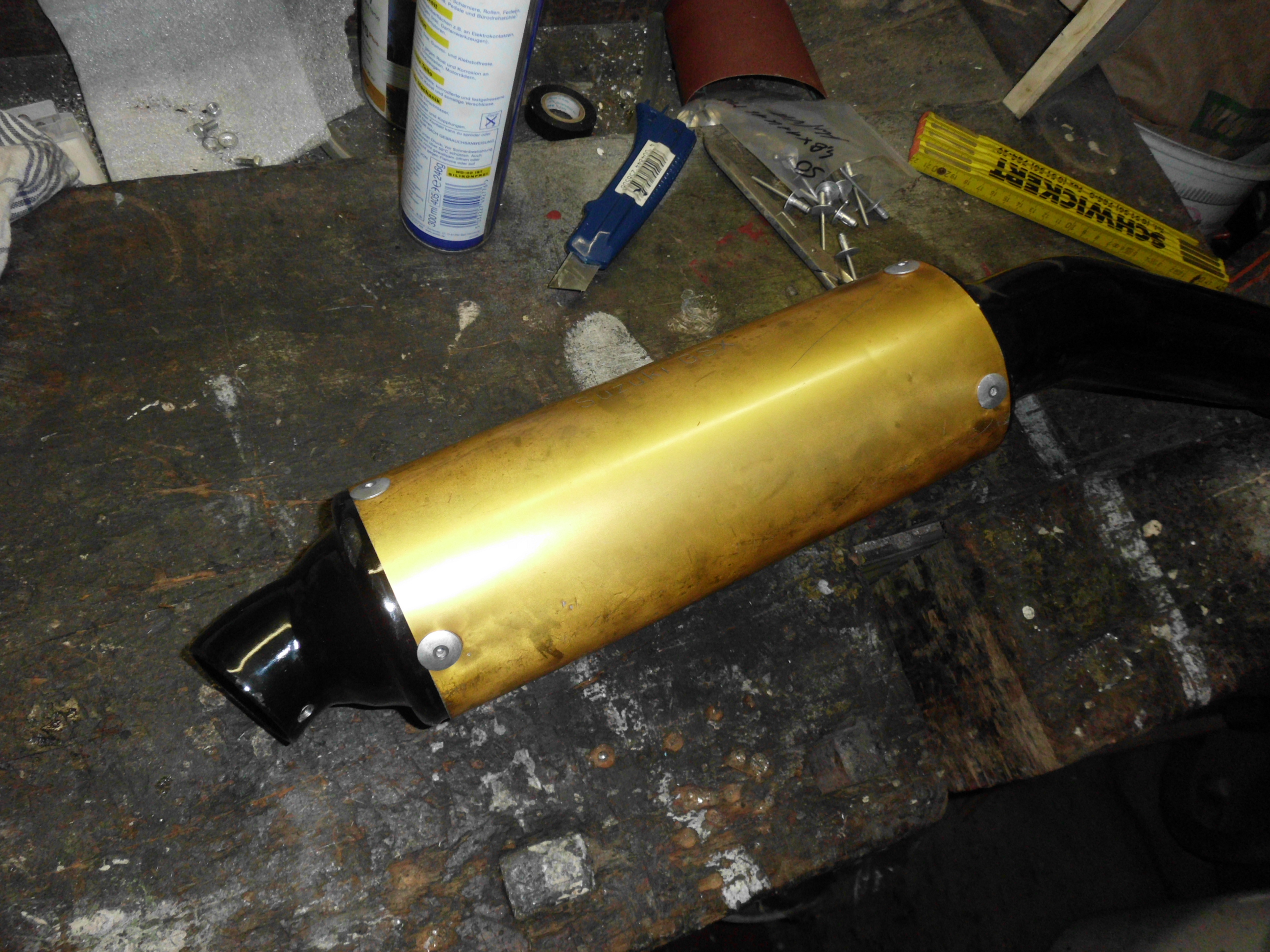 Deshalb habe ich mir kurzerhand einen passenden Ring gedreht, der innen in den Endtopf reinkommt, an der Endkappe wird der mit dem goldenen Blech zusammen vernietet uUnd am Endrohr durch neu gebohrte Löcher verschweißt ... Dann mit den Dämmmatten von Tante Louise alles umwickelt und das Paket mit etwas Draht gesichert ... Alles wieder in den Endtopf gesteckt und wieder schön vernietet ...