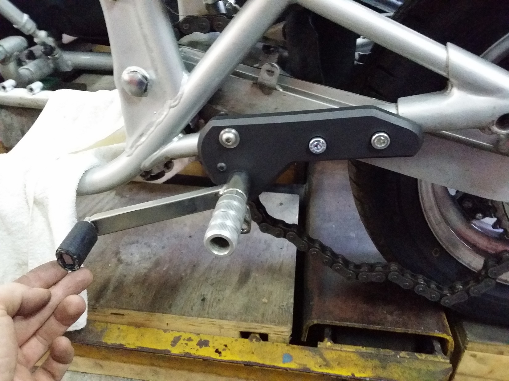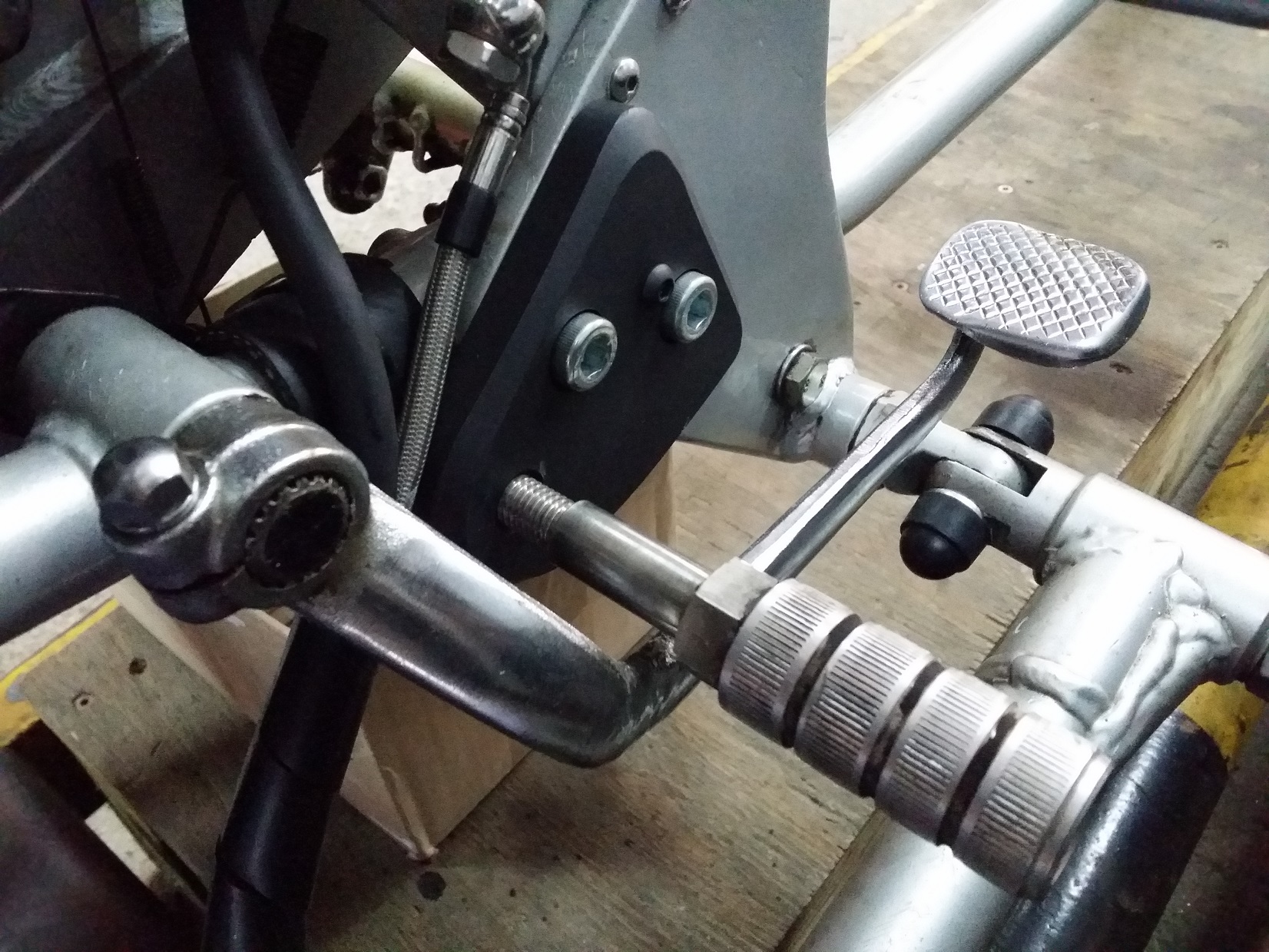 Bestehen aus 15 mm Aluplatten, GS 550 Katana Bremshebel (umgeschweißt), Gimbel Schalthebel, Schaltgestänge mit Gelenkköpfen, 28 mm Alufußrasten mit Aufnahmebolzen