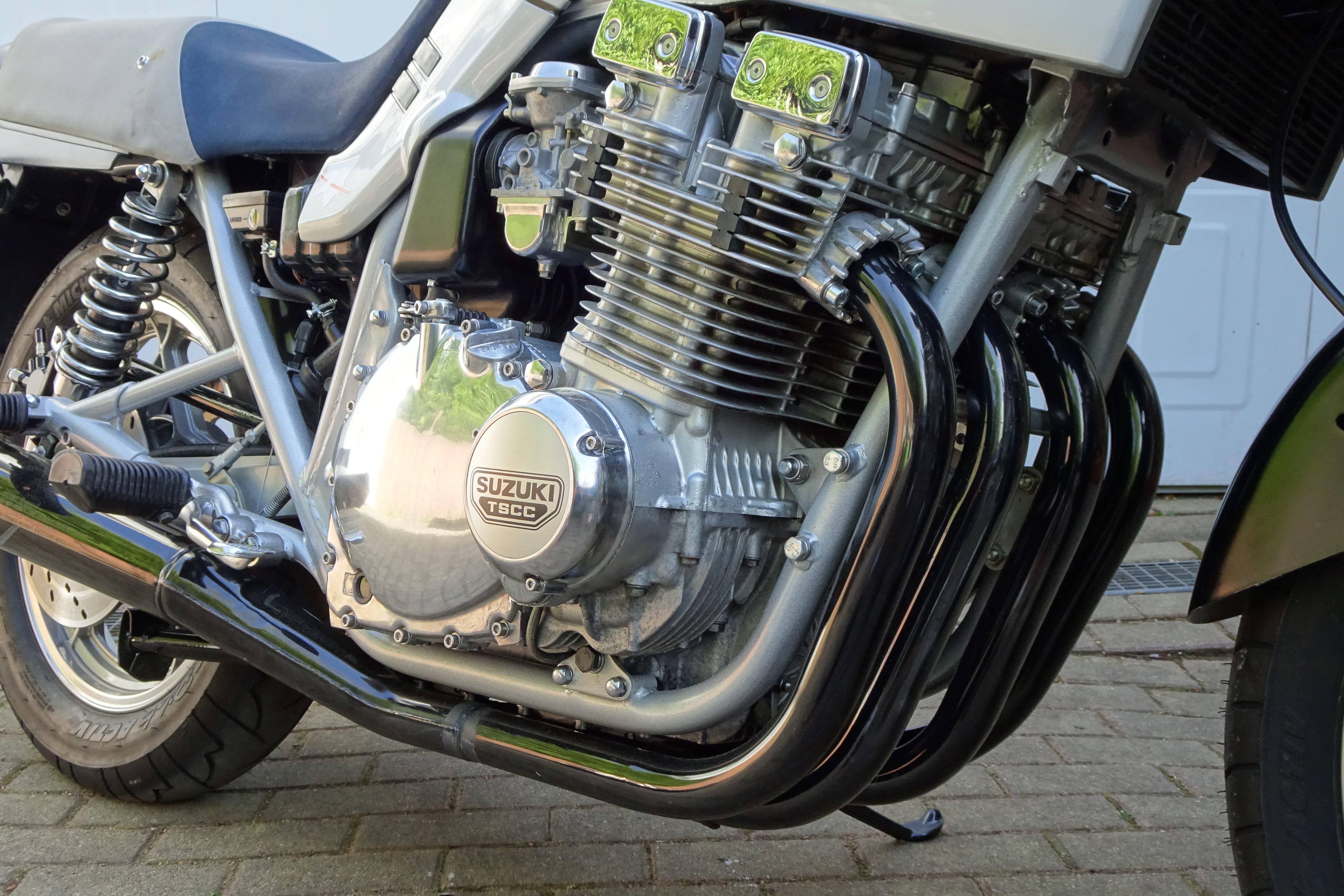 Also nun mal den Rahmen hübsch pulverbeschichten lassen. Das passende Katanasilber gab´s leider nicht, dafür ein etwas stärker reflektierendes. Glänzt wunderschön bei Sonnenschein. Den schönen Rahmen neben die Räder gestellt ergab zweifelsfrei: Auch die müssen lackiert werden. Unter dem Klarlack der Räder hatte sich Korrosion gebildet. Sah schlimm hässlich aus. Also erstmal ins Internet, schaun, wie man die Radlager rausbekommt. Werkzeug bestellt und rausklopfen. Auch die Räder erstmal pulverbeschichten. Spätestens jetzt hatte mich der Originalvirus befallen. Geld und Zeit spielen keine Rolle. Ob das Ding fährt, ist auch egal, Hauptsache original. Die Räder waren im Original lackiert, die Flanken aber geschliffen. Also hab ich die Flanken polieren lassen, um möglichst nahe an das Original zu kommen. Hab mich ein wenig geärgert, dass der Farbton nicht ganz dem Originalfarbton entspricht.