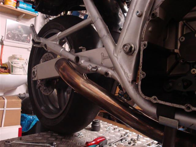 Fazit: Krümmeranlage stößt an das Rahmenquerrohr an und ist nur mit etwas größerem Aufwand, d.h. Umschweißarbeiten zu verwenden. Hab ich aber keine Lust zu gehabt, außerdem ist die schicke neue Tröte dazu eigentlich zu schade.