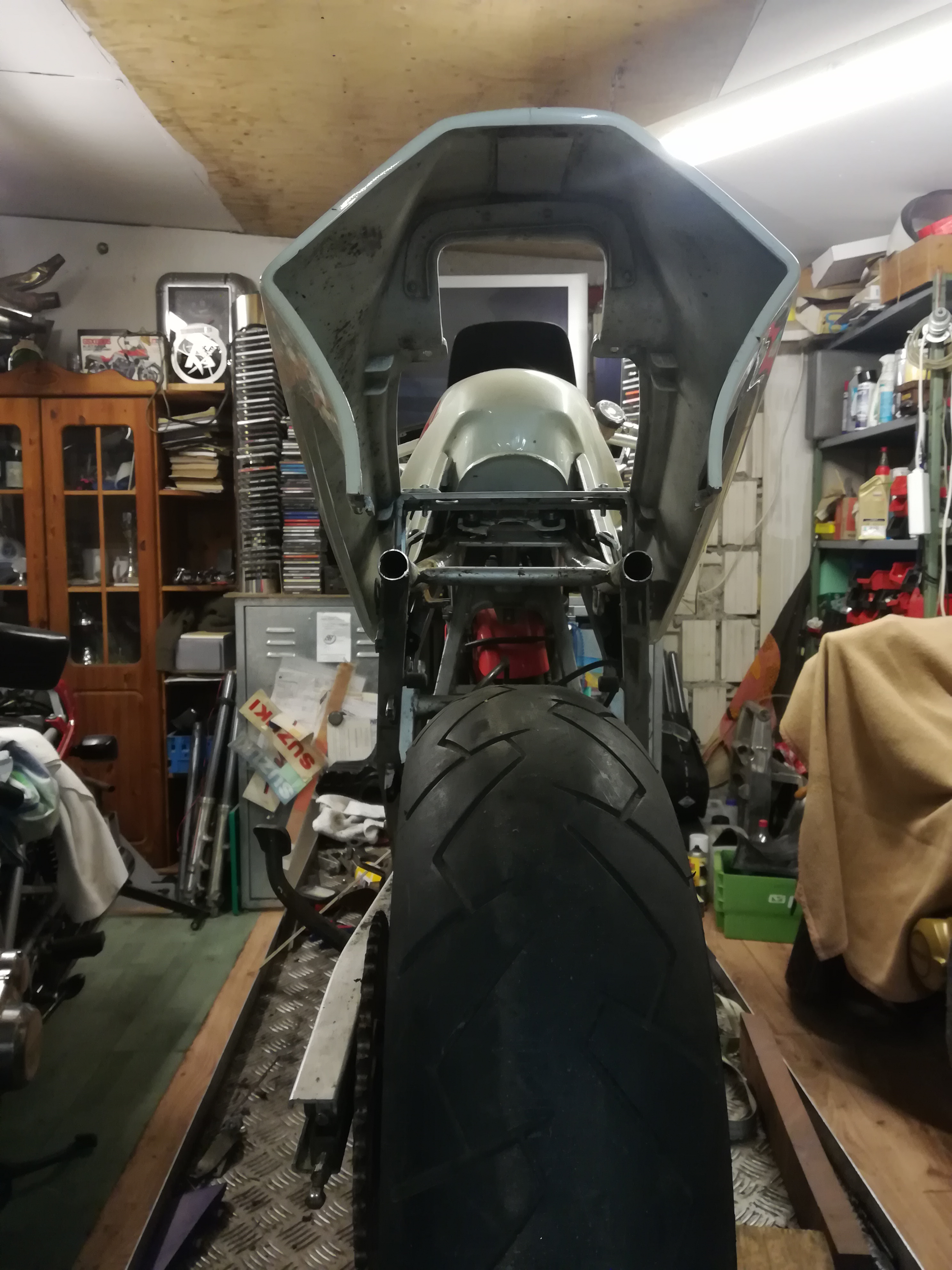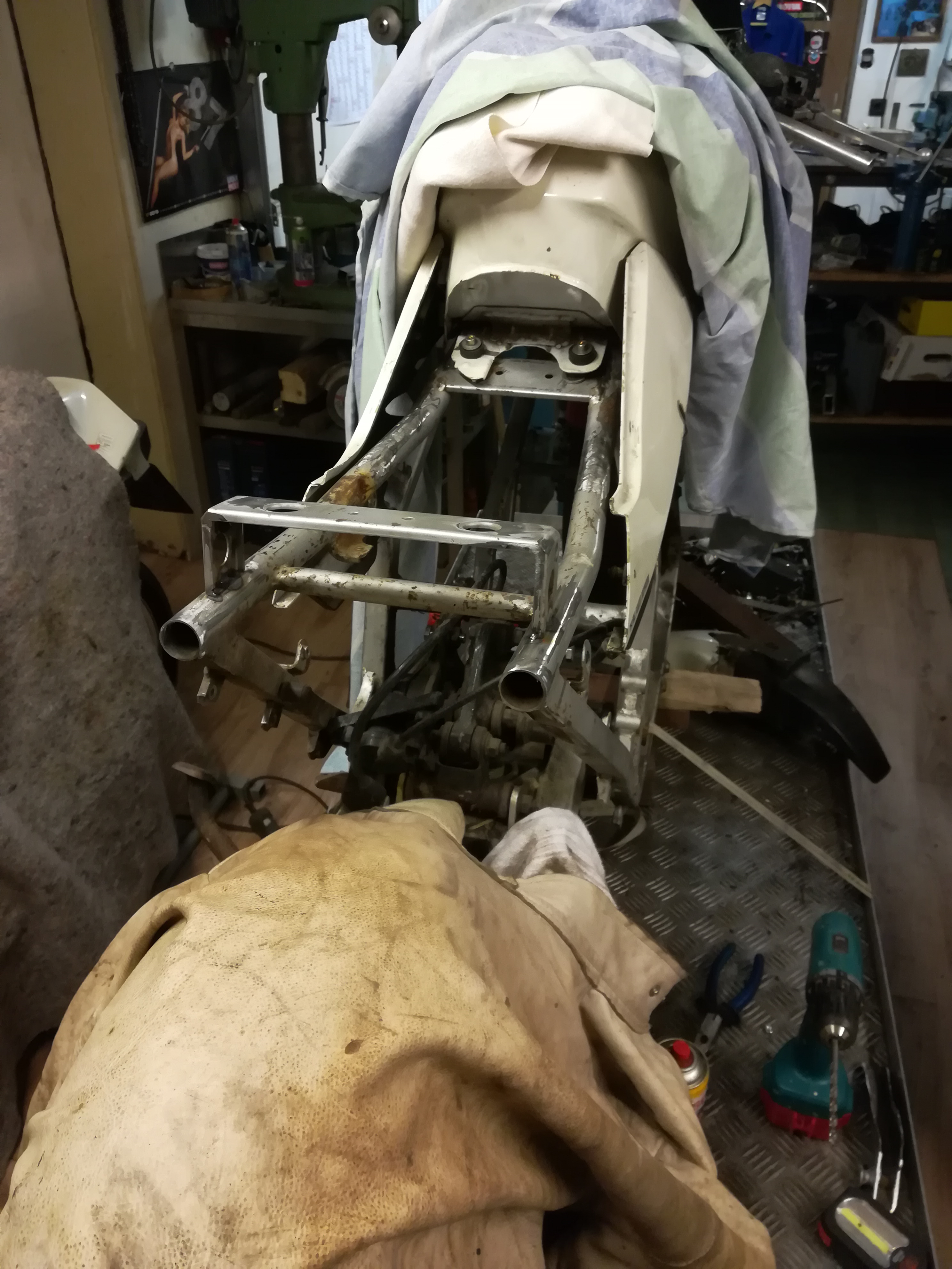 Heck ist schon mal gestrippt. Bin nur noch am Überlegen, ob ich es warm mache oder die Enden hinter Stossdämpferaufnahme mit der Flex einschneide, dann nach oben biege und wieder verschweiße.