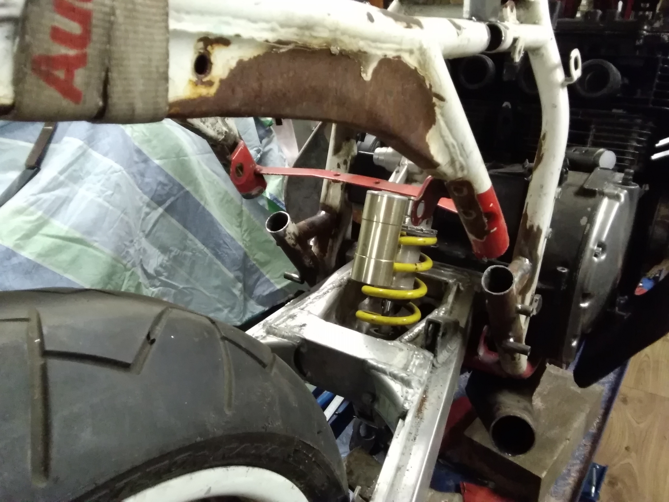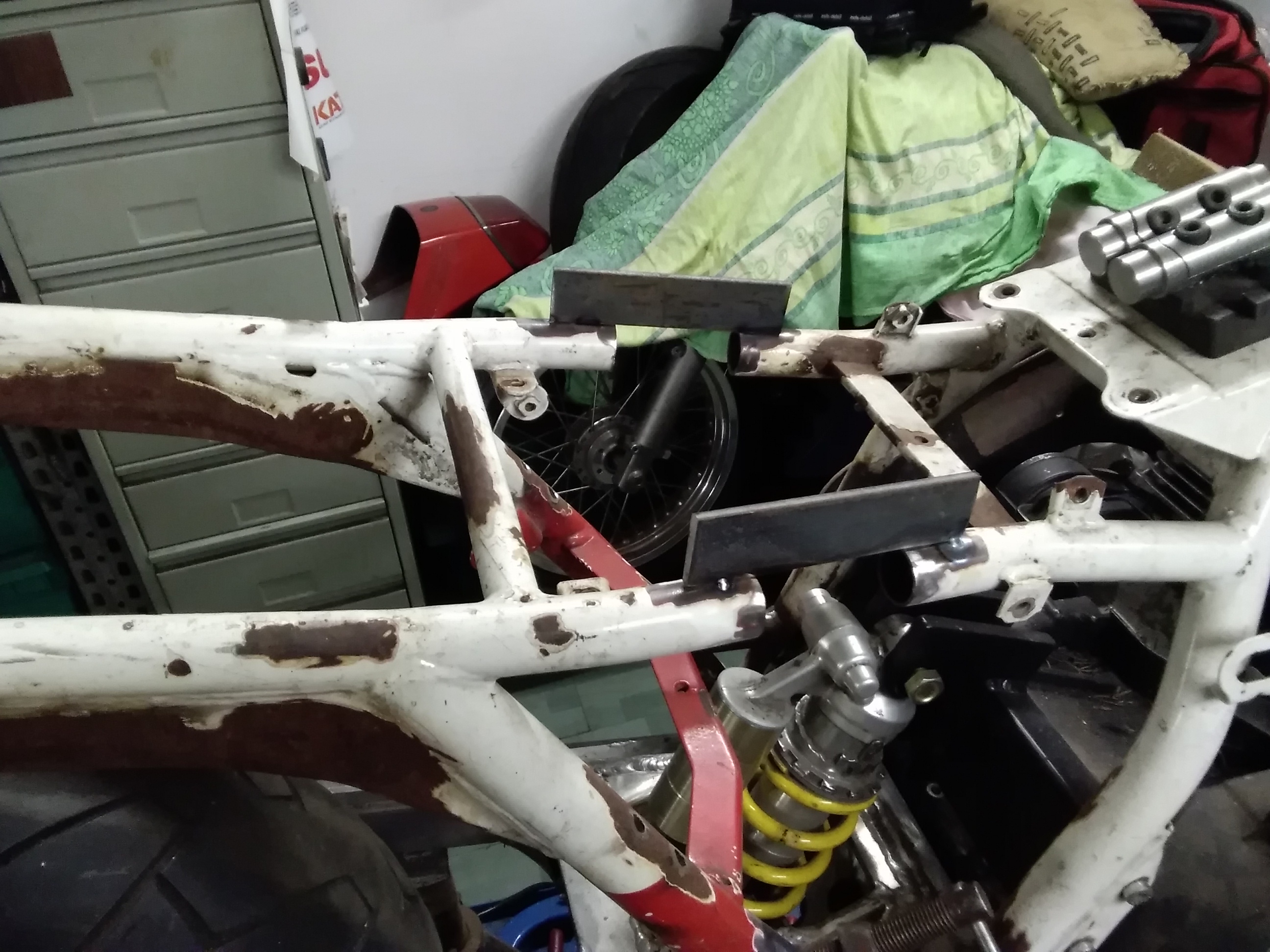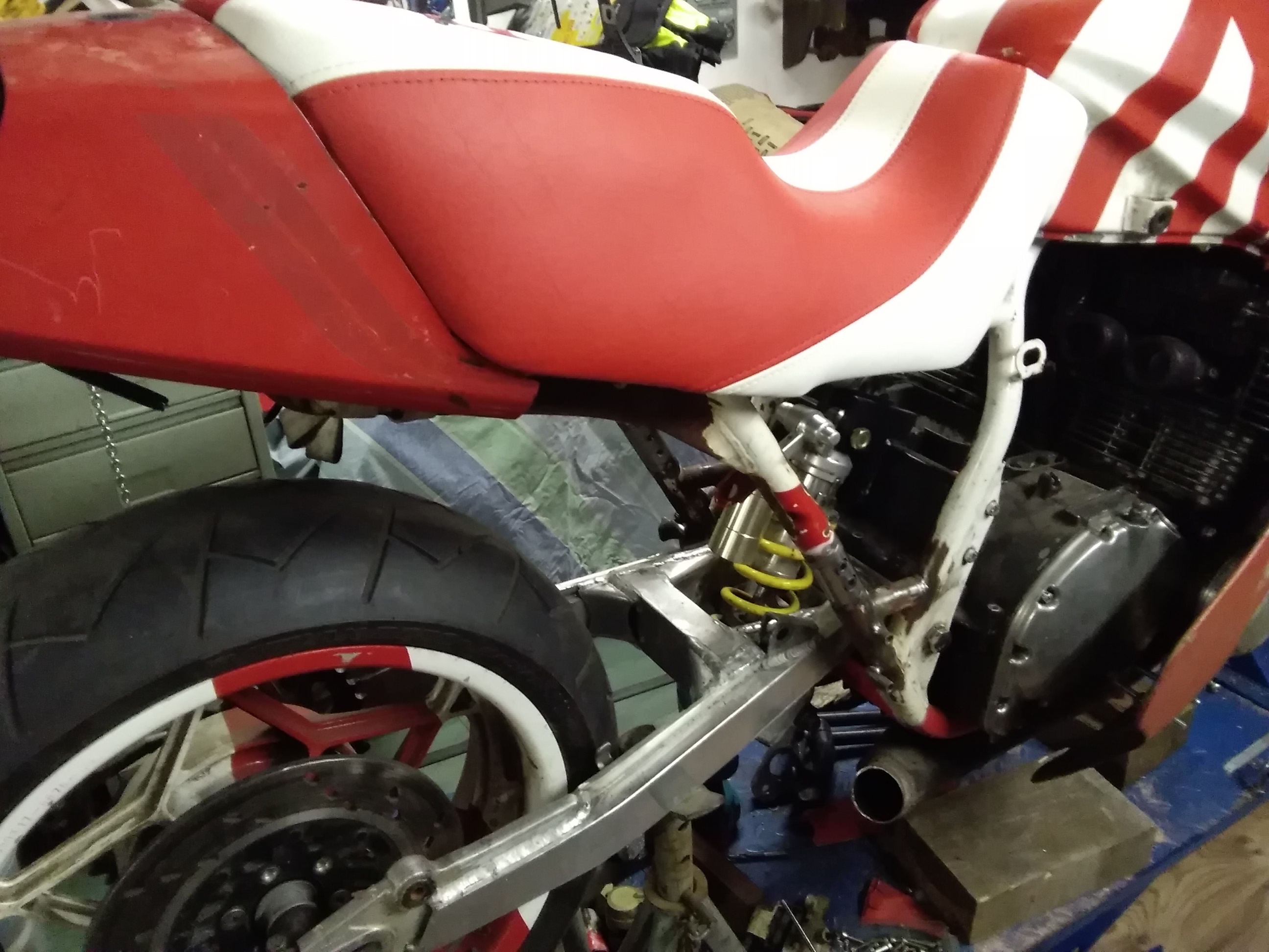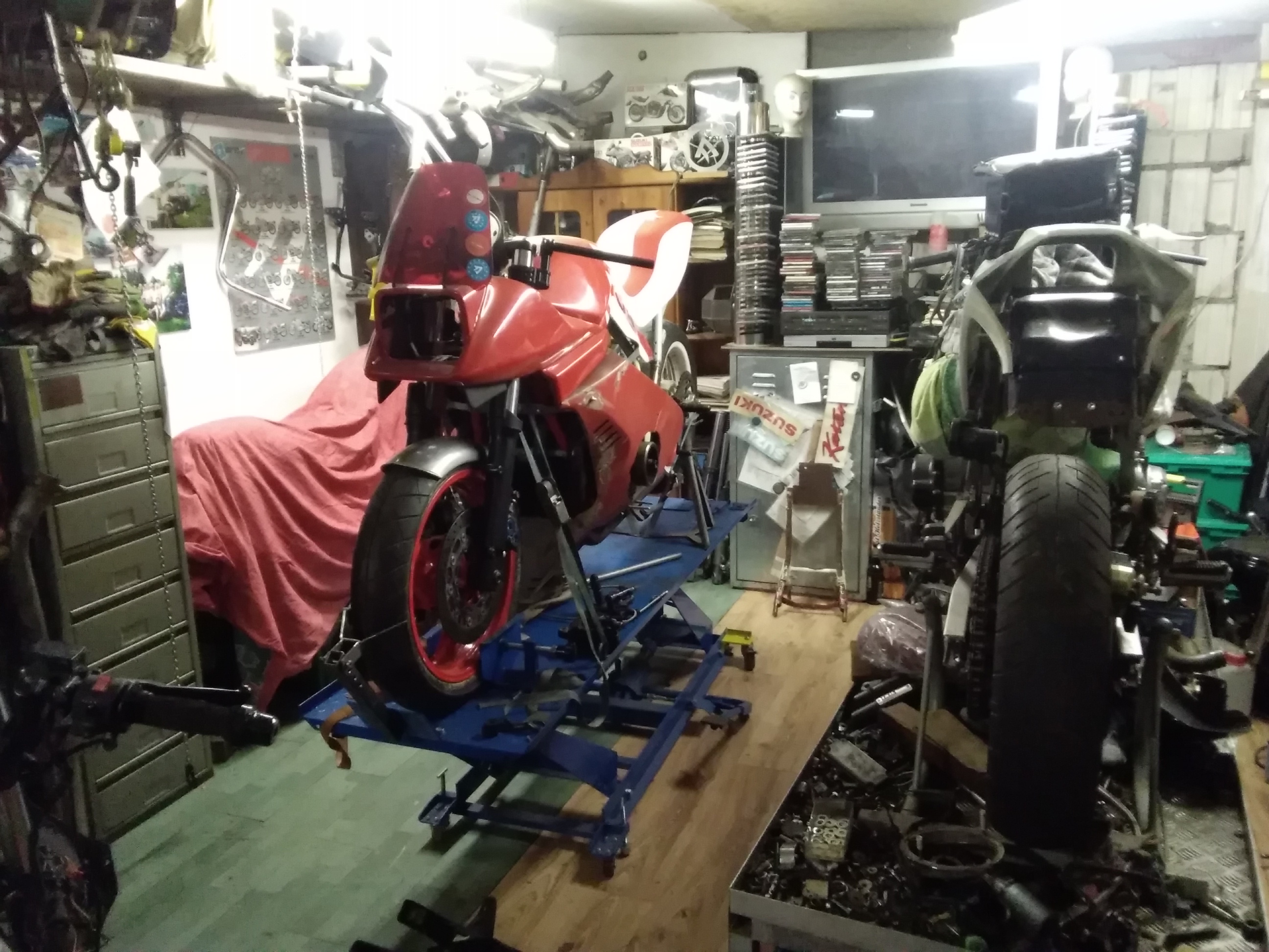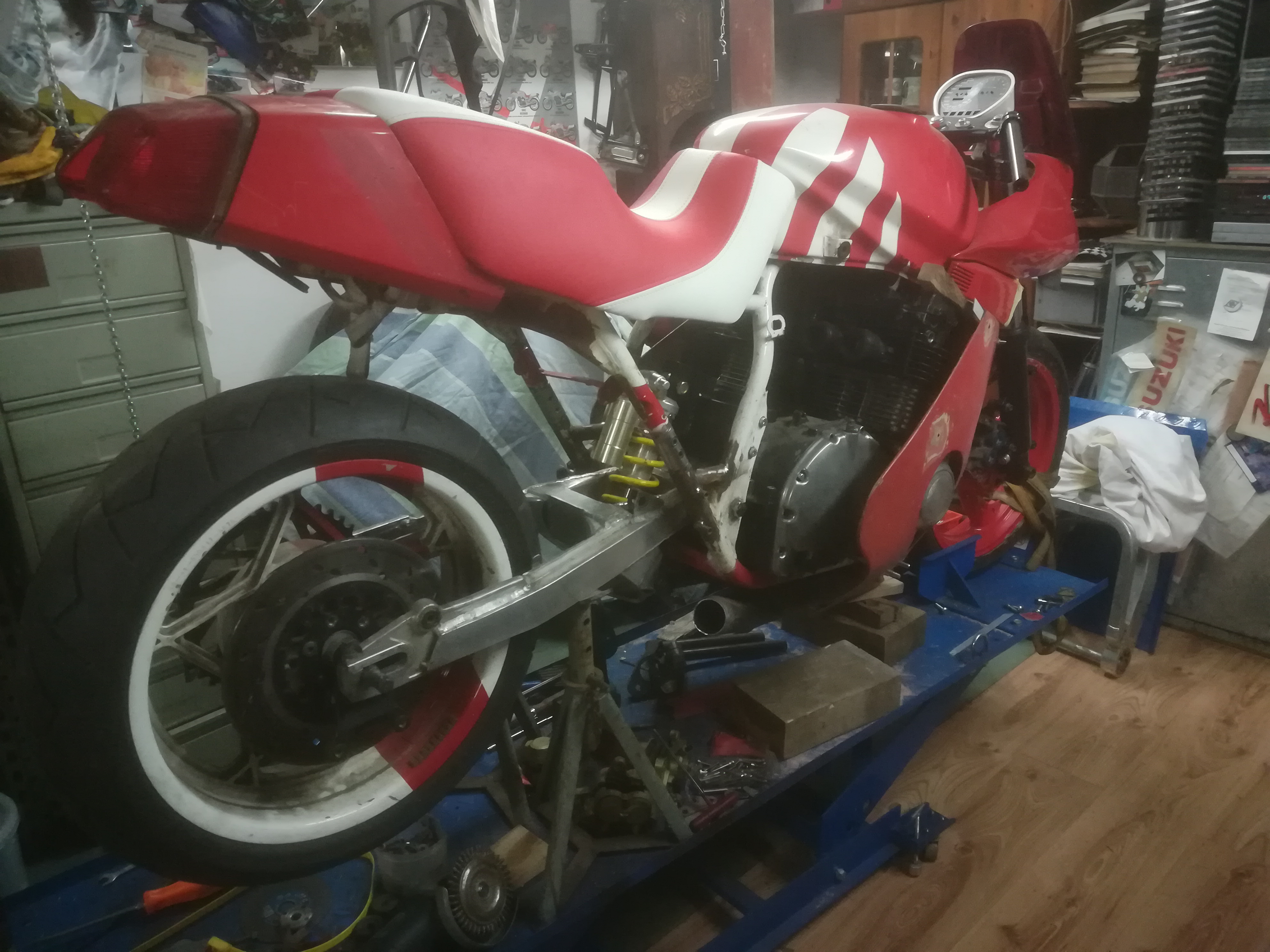 Trotz der vielen Arbeit ist mal etwas Zeit gewesen, um an der rot /weißen weiter zu bauen. Frontend steht, Telegabel von der Yamaha YZF 1000 R eingebaut, Bremsscheiben von der R1.. Passt hervorragend.