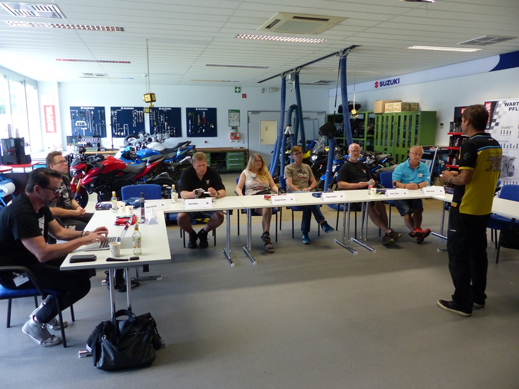 hier mal ein kurzer Bericht vom Technik-Seminar bei Suzuki. Nach einer ausführlichen Begrüßungsrunde im Technik-Schulungsraum von Suzuki Deutschland (da wo auch die ganzen Suzukischrauber geschult werden!), haben wir von Norbert K. (Schulungsleiter Motorräder) eine kurze Zeitreise durch die Geschichte von Suzuki in Deutschland gemacht. Anschließend wurden die Themen für den Nachmittag eruiert, die wir dann nach der Mittagspause und einer kurzen Führung durch die Büros in Angriff genommen haben. Hauptthema war das Fahrwerk.