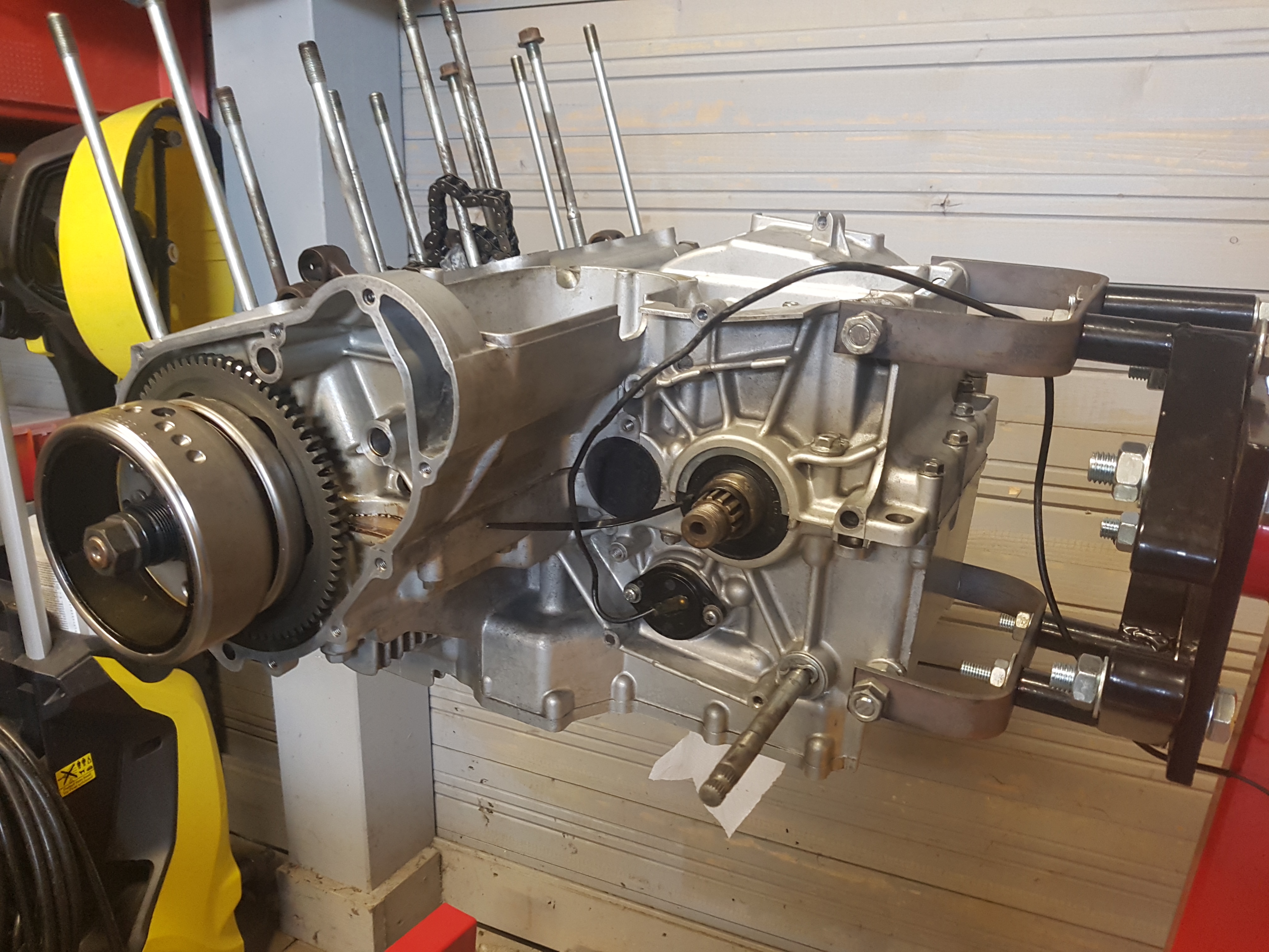 Meinen anfänglichen Plan den Block nicht zu trennen, habe ich nun doch verworfen und den ganzen Krempel zu Ingo Wrubel gebracht. Nach erster Sichtung ist der Kopf i.O und kann so weiterverwendet werden. Die Getrieberäder für den 5. Gang haben Pitting und werden ersetzt. Kurbelwelle, Nockenwellen etc. lt. Ingo alles gut. Zylinder werden aufgebohrt und REC Kolben für 1170 ccm kommen rein. Grosse Ölpumpe war schon drin und der ganze leere Block ist jetzt beim Strahlen, damit ich ihn danach lackieren kann. Die Seitendeckel sind schwarz-matt kunststoffbeschichtet. Ingo macht nur leichte Bearbeitung, weil ich nicht auf Spitzenleistung aus bin, sondern mehr Wert auf Drehmoment lege. Mal sehen, ob dann noch die andere Zündung ins Budget passt. Danach ist alles von Grund auf neu und ich habe hoffentlich die nächsten Jahre motorseitig Ruhe.