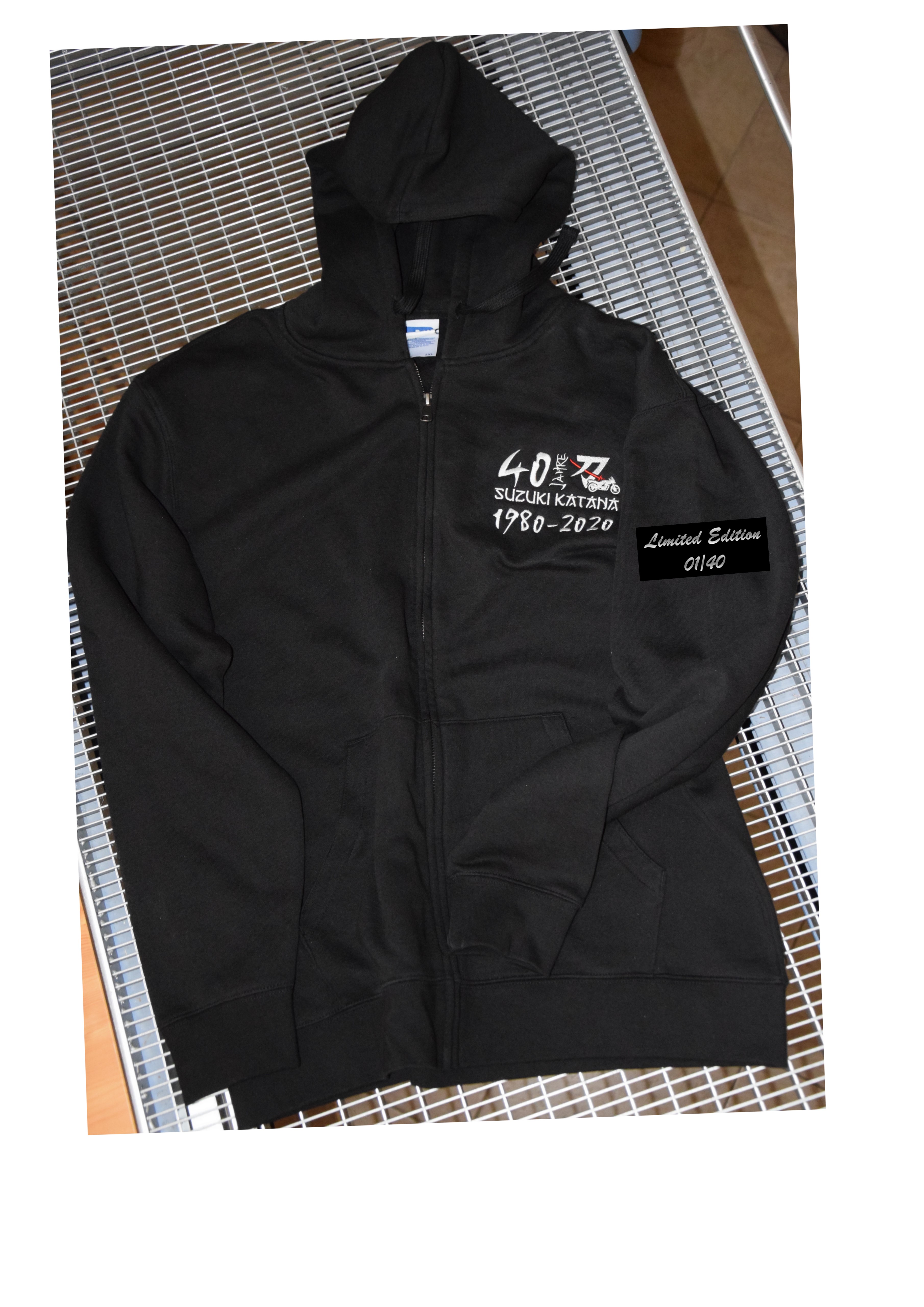 Wir werden eine Auflage von genau nur vierzig schwarzen Hoody´s bzw. Kapuzenjacken mit diesen aufgestickten Logo Produzieren! Als Limited Edition sind die Kleidungsstücke natürlich durchnummeriert! Hier mal ein Muster mit Bildtechnisch eingefügter Nummerierung!