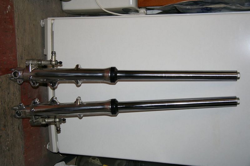 Da ich in dem Zuge auch mal ein paar neue Lenkkopflager verbaut habe, habe ich gleich die Gabelrohre demontiert und auch überholt. Dabei wurden auch die Standrohre poliert und die Gabelrohre dann mit WhitePower Federn neu bestückt ...