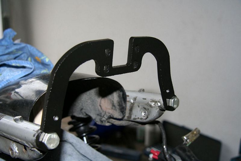 Durch etliches Probieren und Dranhalten, habe ich letztendlich in den Endtopfhalter ein zweites höheres Loch gebohrt, den Endtopf etwas nach außen gedreht und dann von außen an den Fussrastenausleger montiert.