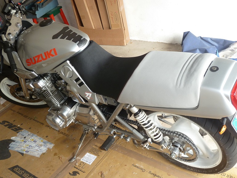 Nachdem ich ja nun den grössten Teil der saison ziemlich Pech hatte ( der eine oder andere wird sich erinnern, Stichwort Auspuff) gibts jetzt was gutes zu vermelden. Ich hatte vor geraumer Zeit mal ne verranzte Sitzbank bei E.ay geschossen, und wollte damit irgendwann mal was machen. Hab ich jetzt. Und zwar hab ich sie beziehen lassen mit einem Material welches in alle Richtungen dehnbar ist, und rau im "Look and Feel". Das war mir wichtig, denn ich fand immer dass glatte Bezüge speckig aussehen, irgendwie etwas wurstig, und die orginal Sitzbank fand ich immer Klasse. Die verschmutzt aber recht schnell und sieht dann eben auch nimmer sooo doll aus. Daher also nach etlichen Materialproben dieses Zeugs gewählt. Als kleines Schmankerl hab ich die Naht orange machen lassen. Das Ergebnis finde ich saugeil, um es mal so zu sagen. Wer noch nen guten Betrieb sucht mag mir ne PM schreiben, dann sag ich gern wer das gemacht hat ( Schleichwerbungsalarm). Nebenbei war der Preis mehr als akzeptabel. Auf dem einen Bild siehts so ais als ob die Bank nicht richtig sitzt, ist aber nur weil ich sie nur locker aufliegen hatte, und nicht eingerastet habe. So. Ich hoffe mal, das war der Wendepunkt, und rufe Euch ein fröhliches " Auspuffe werden eh überbewertet" zu, auf bald, Gruss,