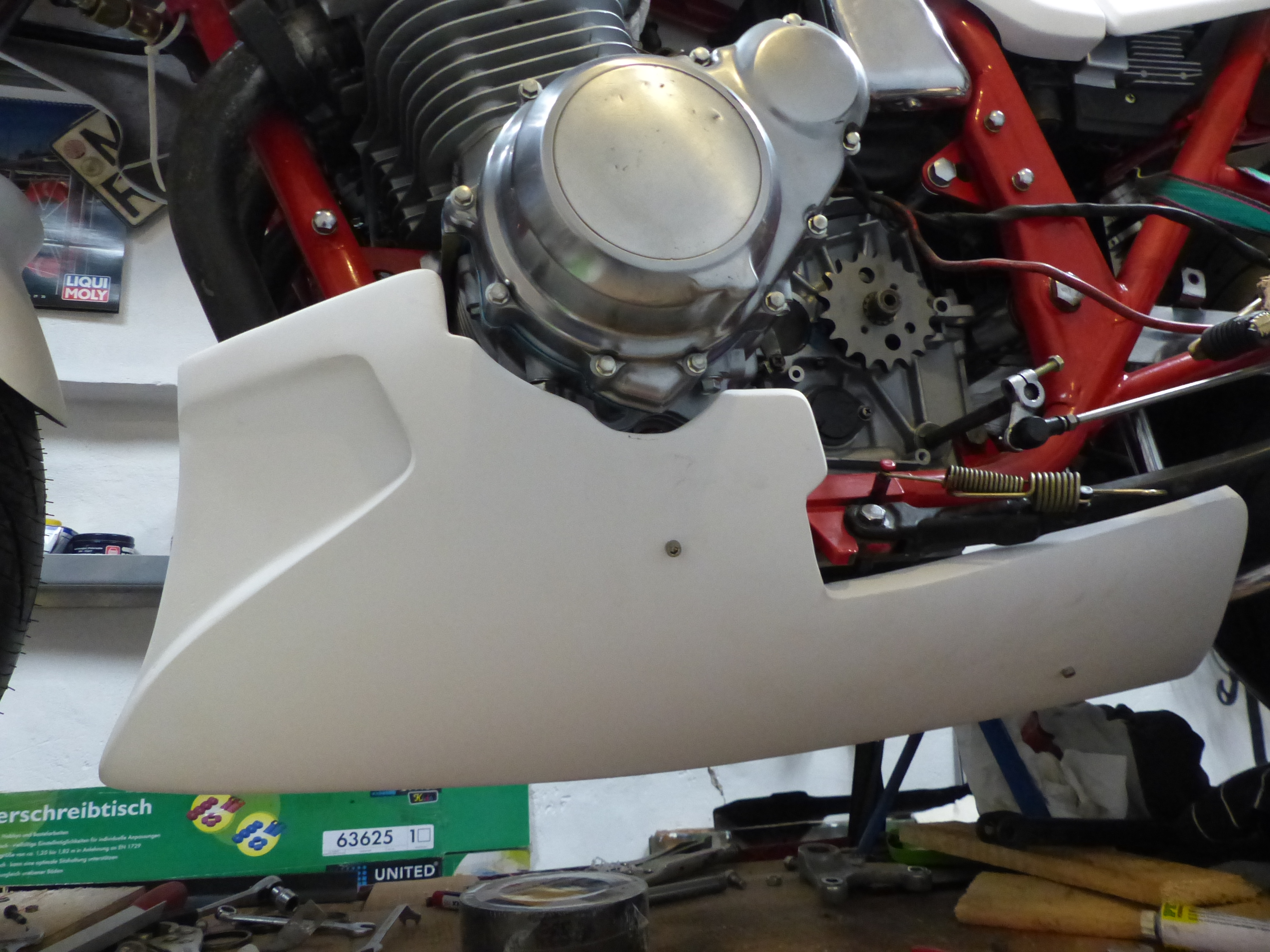 Aber nach dem Radeinbau ging es erst einmal an die Lackteile, da ich nur einen langen Speer-Bugspoiler einer GSX-ES bekommen hatte, musste ich diesen erst einmal an die Kati anpassen - der ES-Spoiler hat etwas andere Aussparungen für den Motor! Und dann noch die sehr MIESE Fertigungsqualität - zum Kot.....!