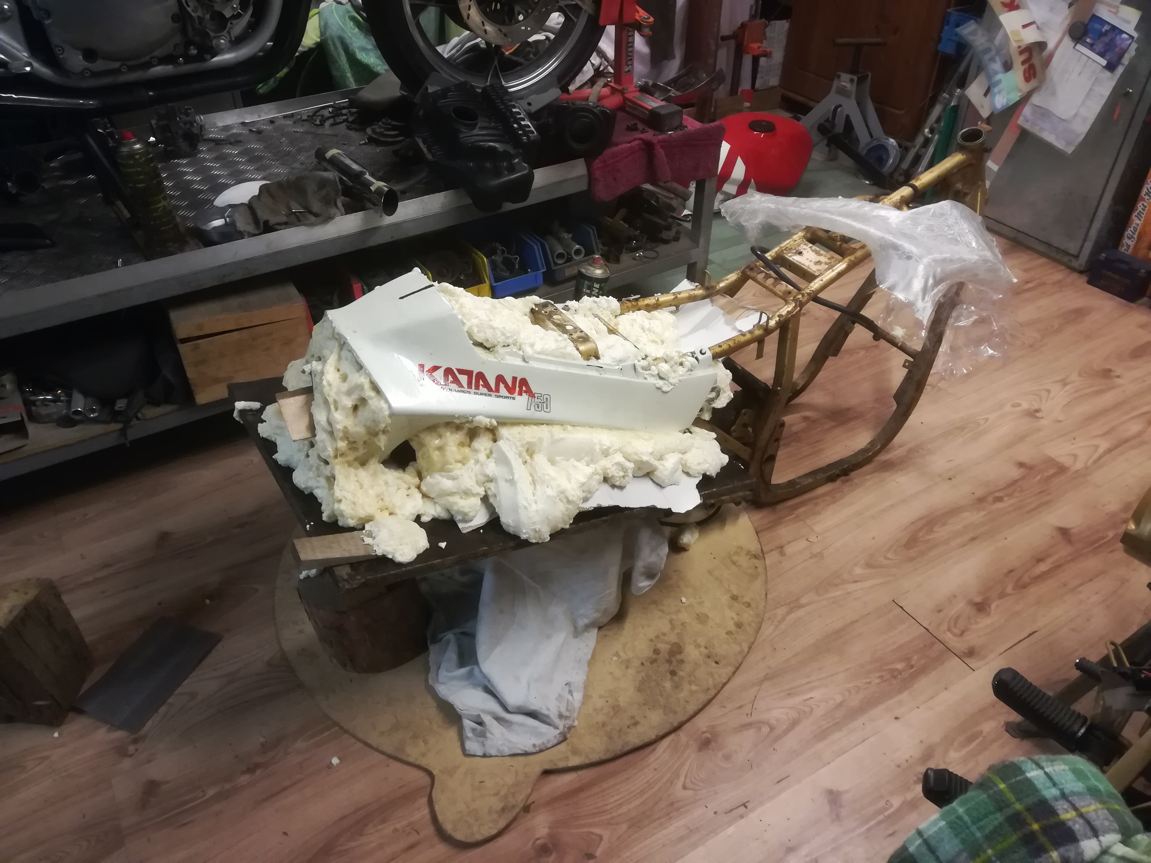Es geht mit der Sitzbank weiter, da ja die Auspuffanlage unter dem Sitz laufen soll und die Originalität der der Verkleidung weitestgehend beibehalten wird, musste ich selbst Hand anlegen. Die Heckverkleidung auf den Blanko Rahmen verschraubt und zu geschäumt. Der Abdruck ist halbwegs in Ordnung, spachtel jetzt mit Gips nach