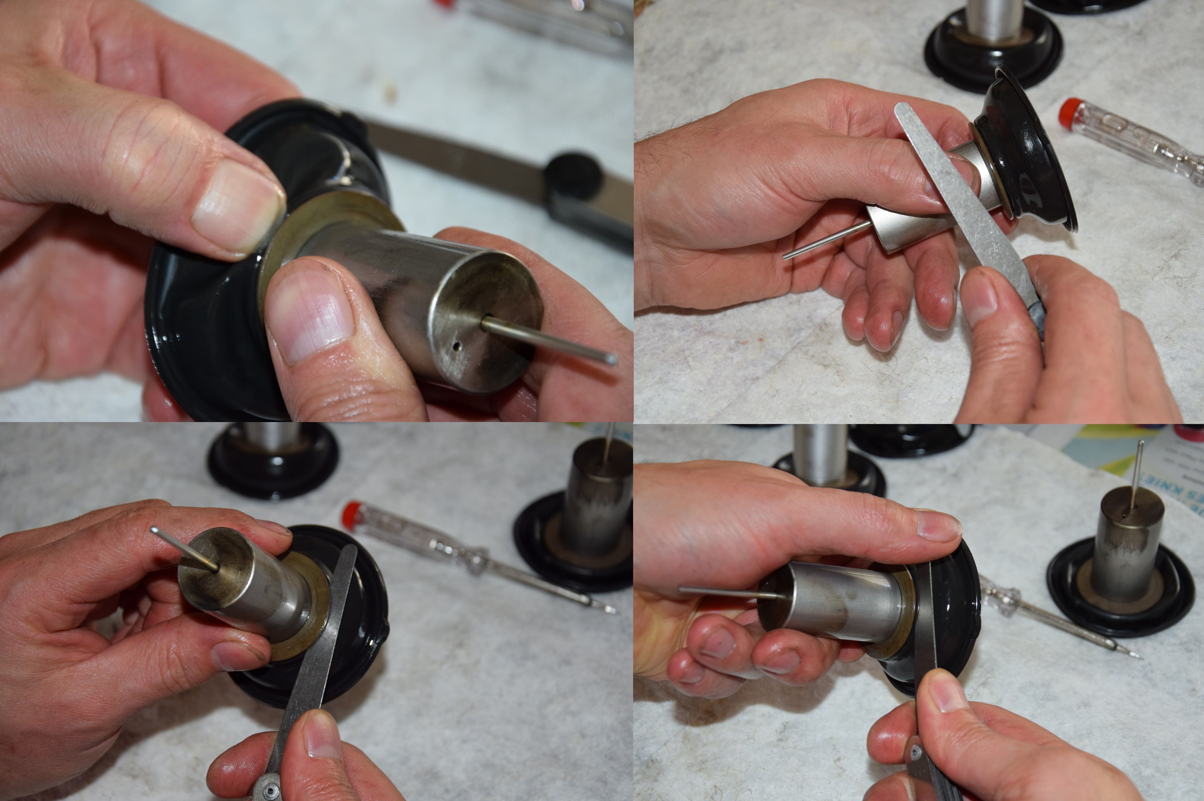 Und dann nehme ich eine Endgratete 0,75mm starke Fühlerlehre und massiere die Membrane wie auf den Bildern zu erkennen in die richtige Position zwischen die Kunststoffringe.