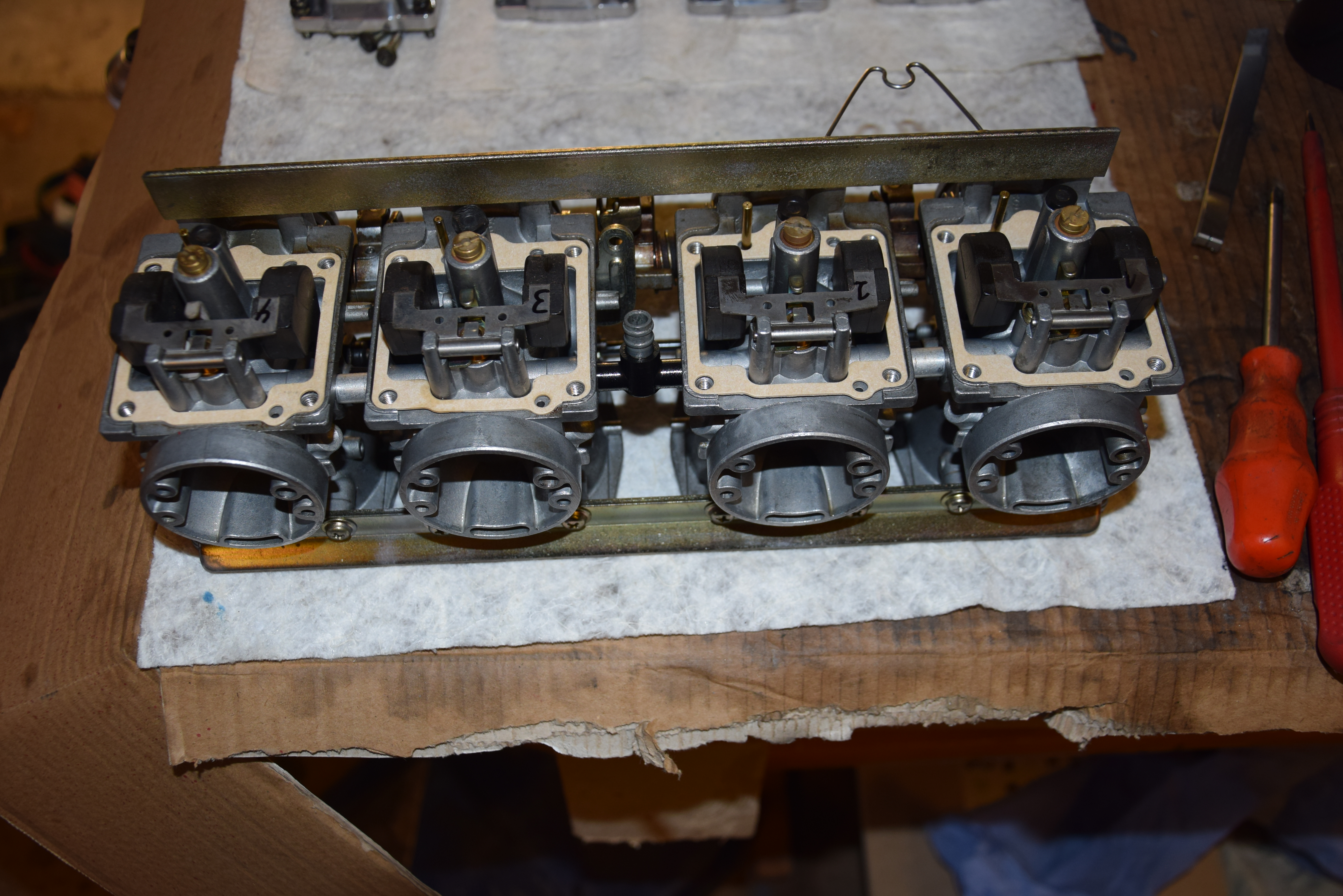 Habe hier eine 11er Vergaserbank die schon einige Jahre im Regal eingelagert war, nachdem ich den Motor für Ralf soweit aufgebaut habe sind jetzt noch die Gaser dran.
