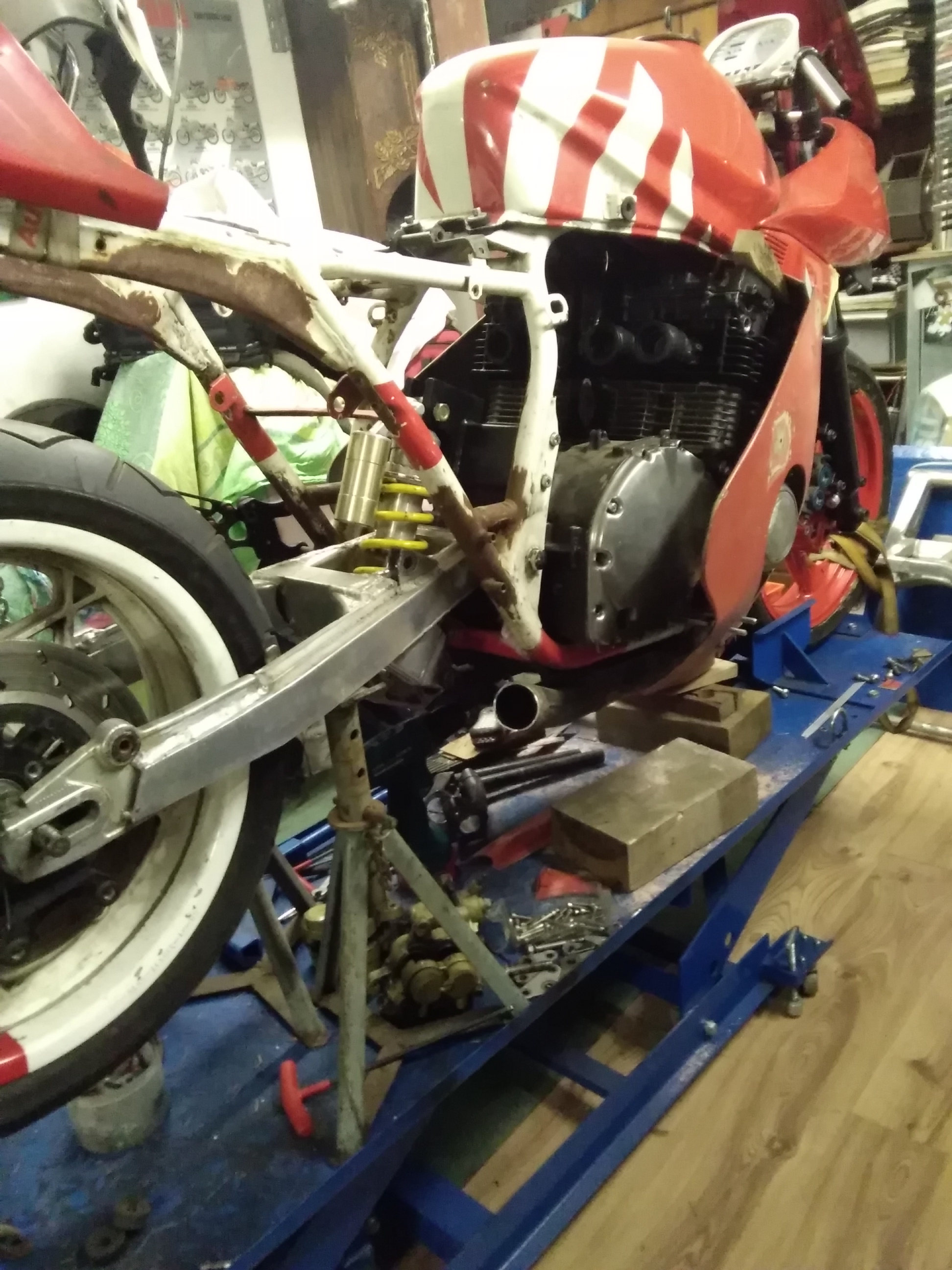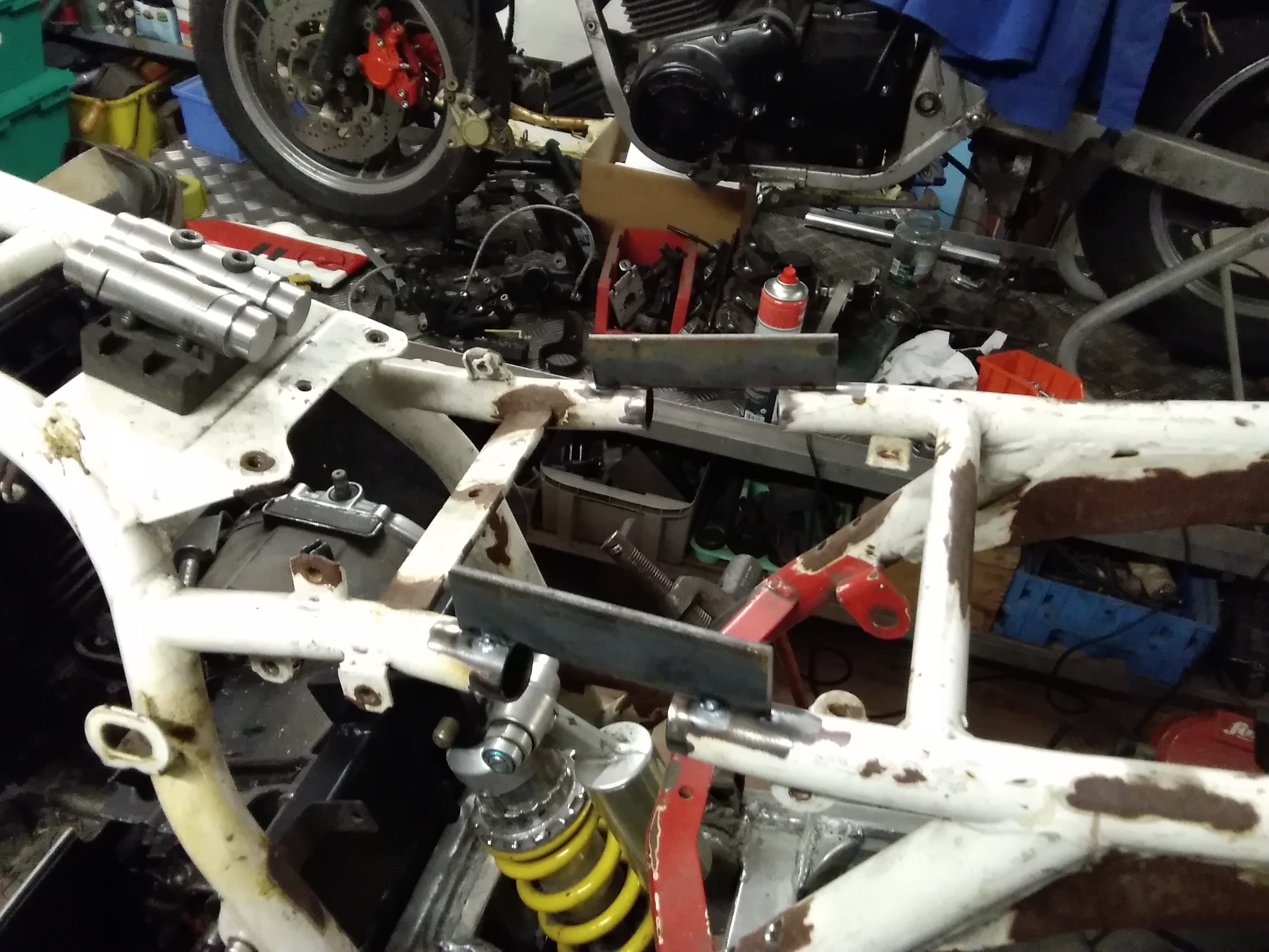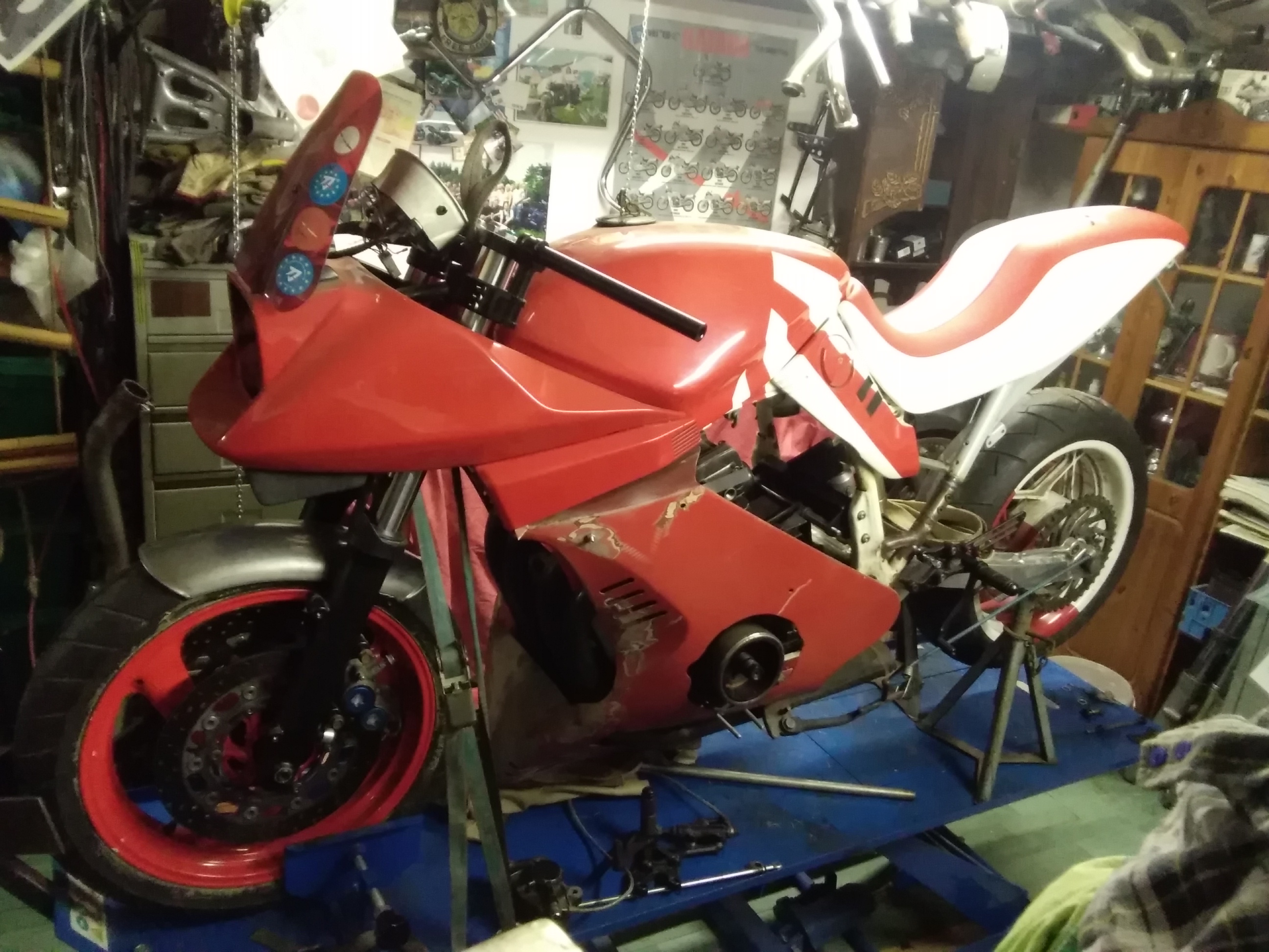 Trotz der vielen Arbeit ist mal etwas Zeit gewesen, um an der rot /weißen weiter zu bauen. Frontend steht, Telegabel von der Yamaha YZF 1000 R eingebaut, Bremsscheiben von der R1.. Passt hervorragend.