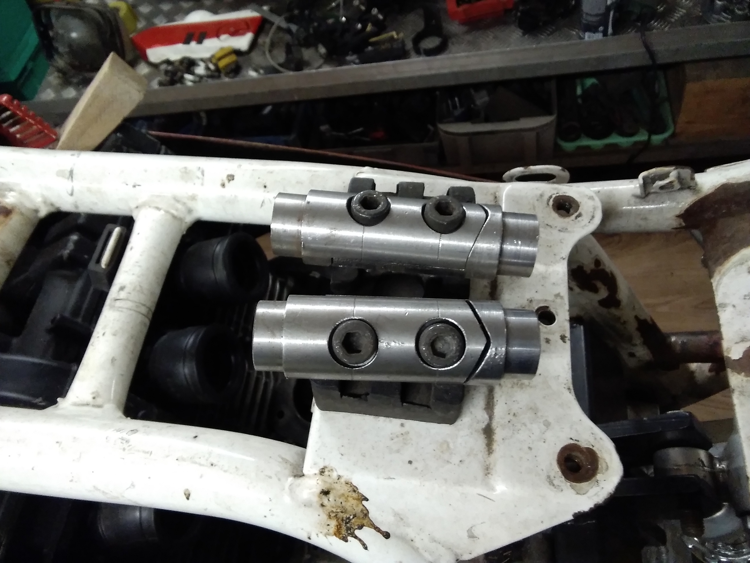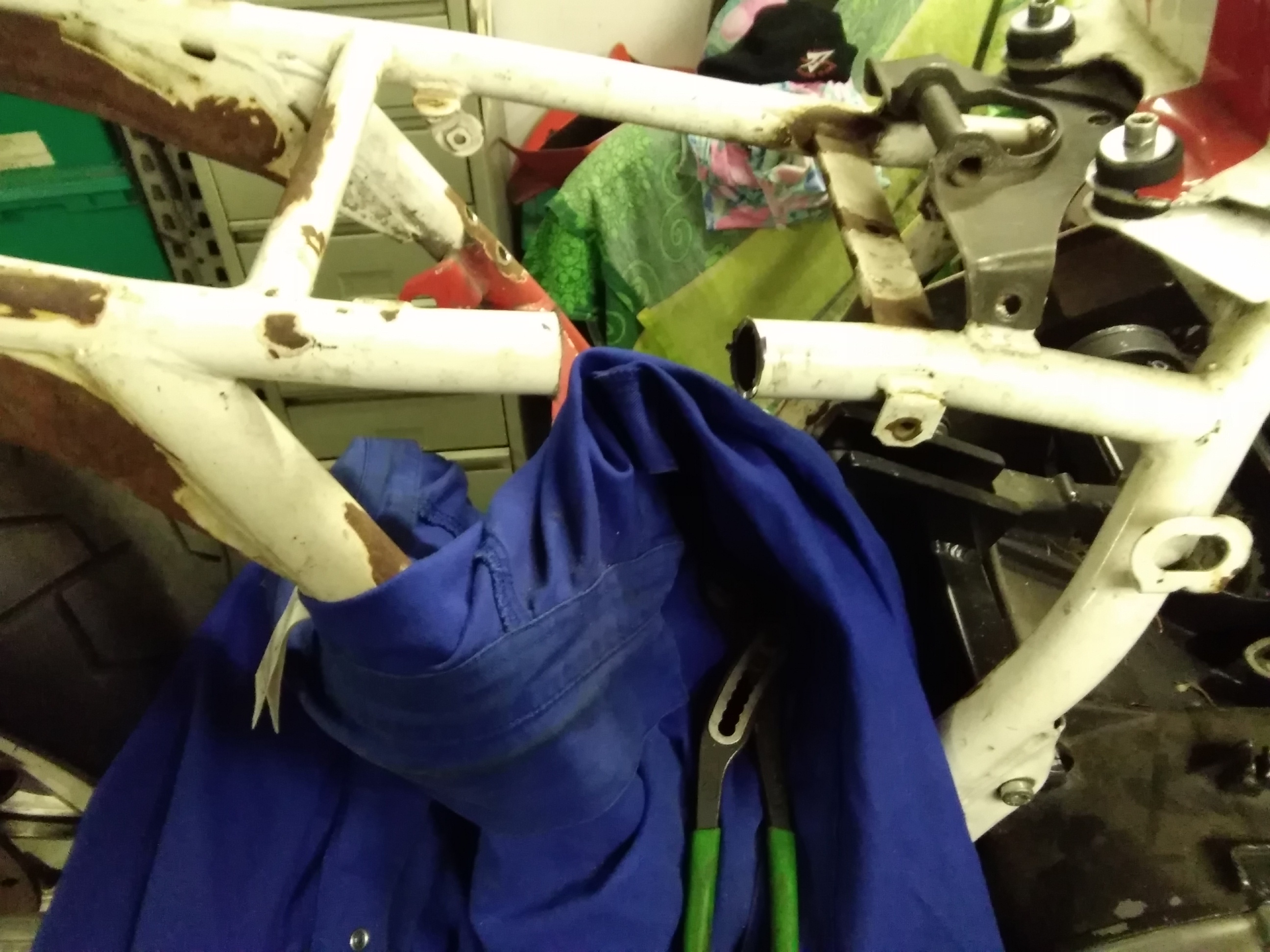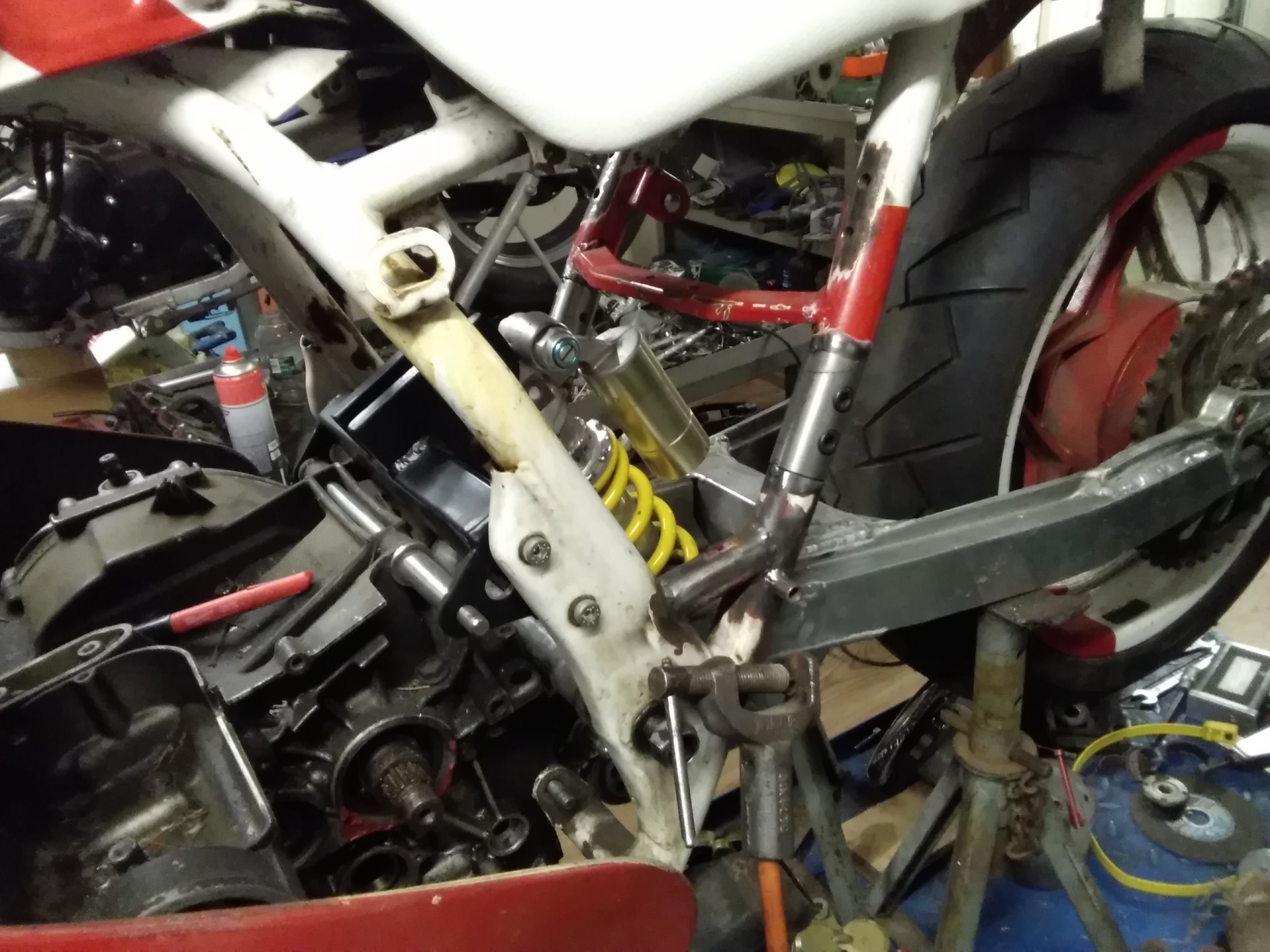 Trotz der vielen Arbeit ist mal etwas Zeit gewesen, um an der rot /weißen weiter zu bauen. Frontend steht, Telegabel von der Yamaha YZF 1000 R eingebaut, Bremsscheiben von der R1.. Passt hervorragend.