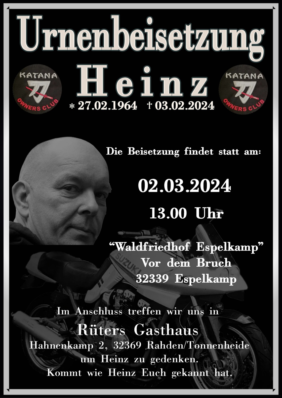 In seiner verbindenden Art pflegte Heinz langjährige, enge Beziehungen insbesondere auch zum Katana Owners Club UK. Die Nachricht von Heinz' Tod ist dort mit Bestürzung aufgenommen worden.