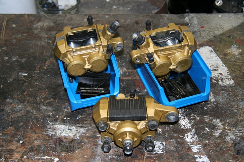 Und weil zwischen Weihnachten und Neujahr so langweilig war, habe ich mal die Bremssättel zerlegt, gereinigt und neu angepinselt. Der hintere ist schon wieder zusammen. Die vorderen bekommen noch neue Dichtungen und Kolben ...