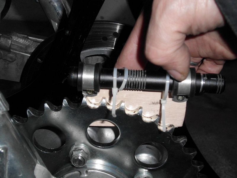 Dann heute nochmal die hintere Felge reingesteckt und in der Schwinge ausgerichtet. Anschließend an das Kettenblatt den Laser angelegt und nach vorne auf´s Ritzel gezielt und die Abstände des Laserpunktes gemessen und verglichen. Leider sieht man den Laserpunkt auf dem Foto nicht ... Ich habe einen Versatz der Kettenflucht von 1,5mm. Wenn man jetzt mal die ganzen japanischen Fertigungstoleranzen von Schwinge, Felge, Rahmen usw. mit berücksichtigt, dann denke ich mal, dass ich mit diesen 1,5mm sehr gut leben kann.
