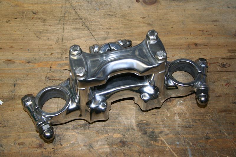 Von der Gabelbrücke habe ich erstmal die störenden Ohren für die originale Cockpitbefestigung entfernt und das ganze Teil dann schon auf Hochglanz polieren lassen.