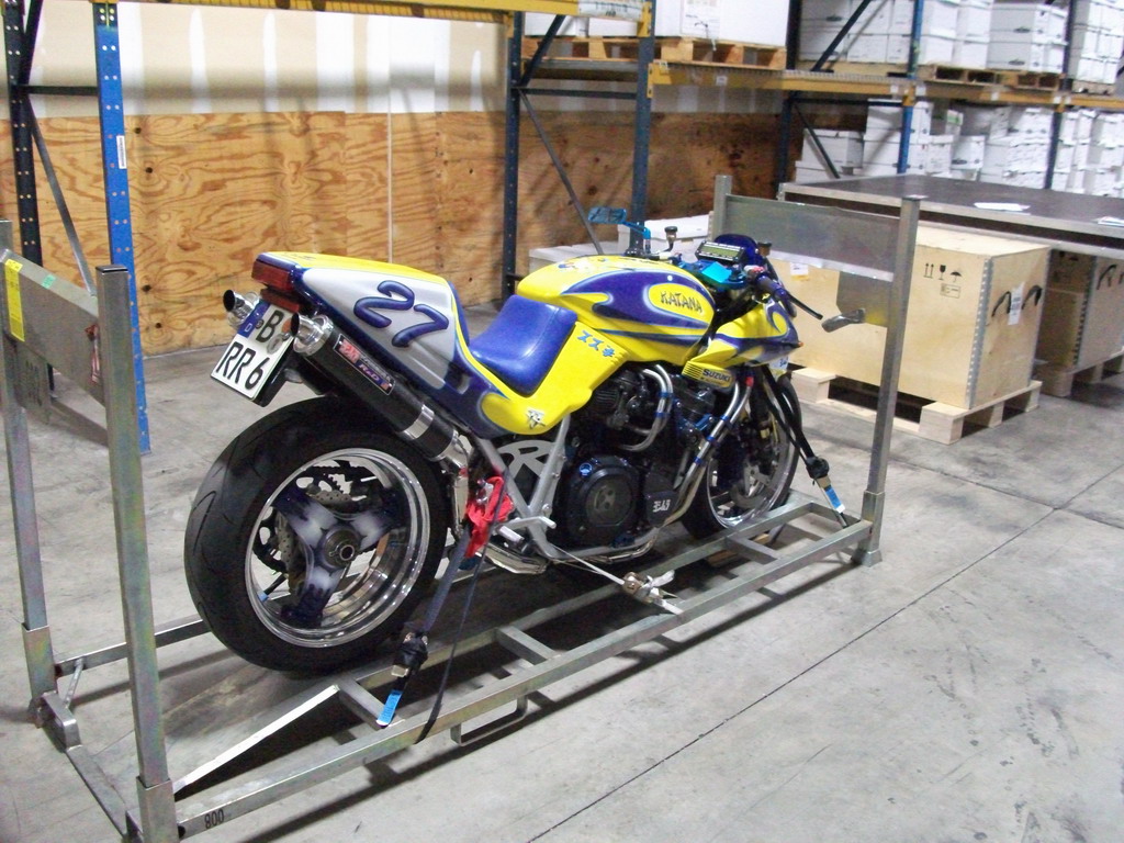 Das Bike kommt wie auf dem Bild zu sehen in ein Transportgestell das dann Komplett