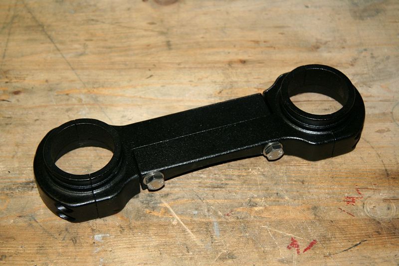 Von der Gabelbrücke habe ich erstmal die störenden Ohren für die originale Cockpitbefestigung entfernt und das ganze Teil dann schon auf Hochglanz polieren lassen.