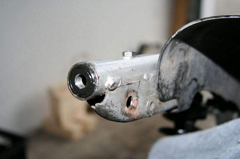 Da ich kein altes Rahmenheck zum Opfern mehr rumliegen hatte, habe ich mir kurzerhand einen Schlossbügel im CAD gezeichnet und aus etwas dickerem Blech auslasern lassen. Diesen Bügel habe ich mit kurzen Stücken 22er Hydraulikrohr verschraubt, so dass ich das Ganze schön in die Rahmenendrohre schieben kann. Dadurch habe ich mir das geschweisse am Rahmen erspart und ich kann jederzeit wieder auf Speerheck oder sogar auf ganz original umbauen.